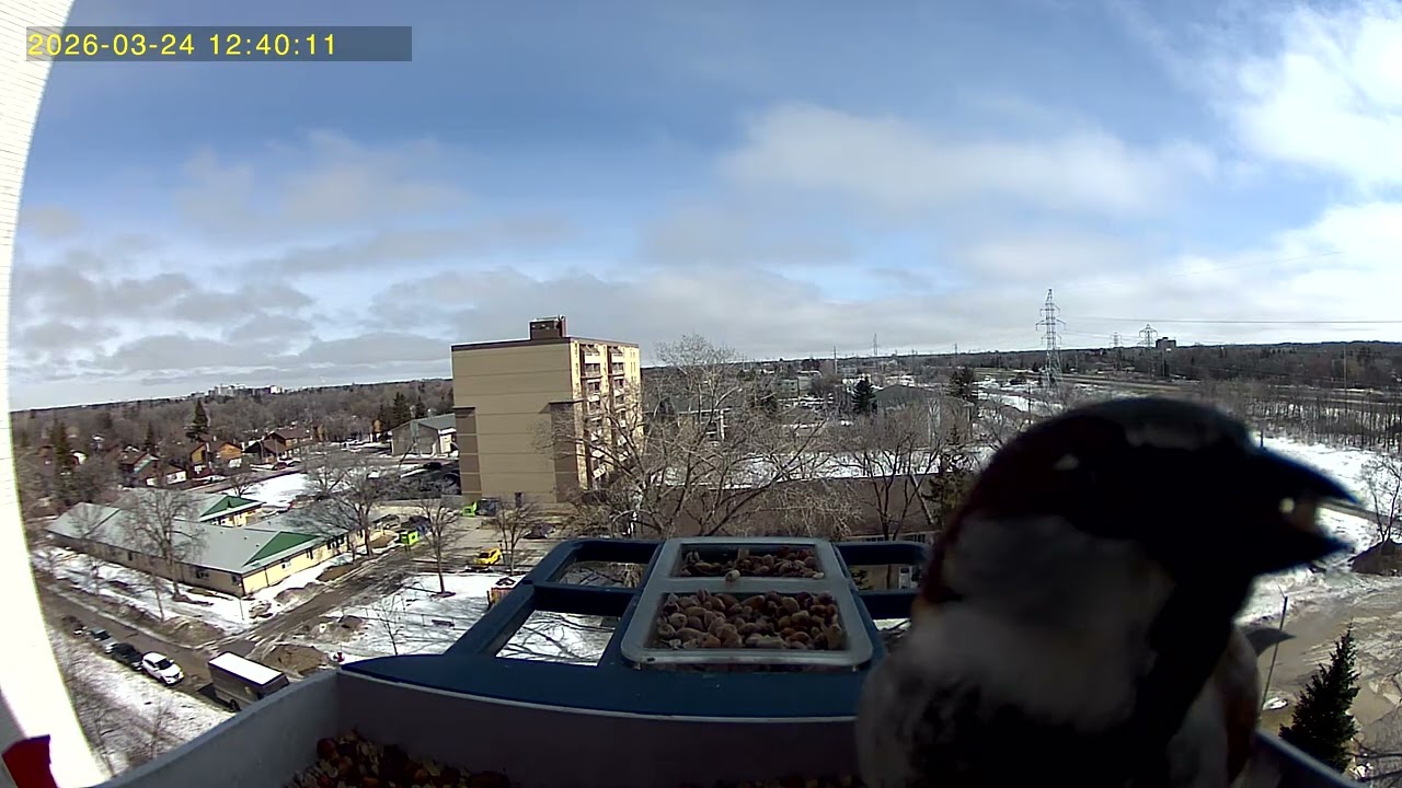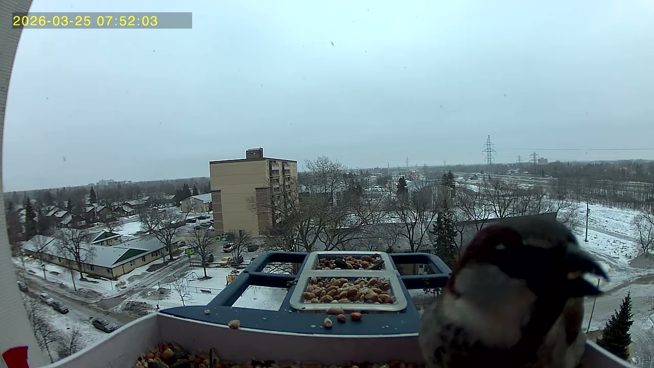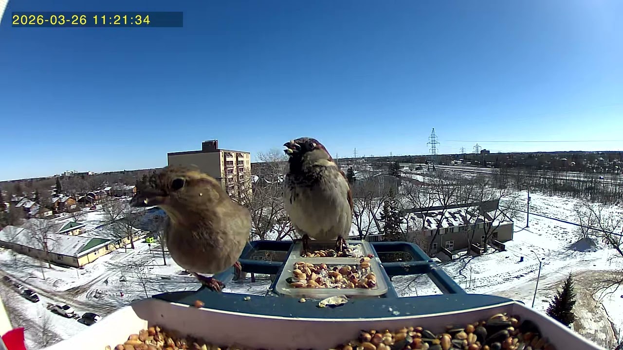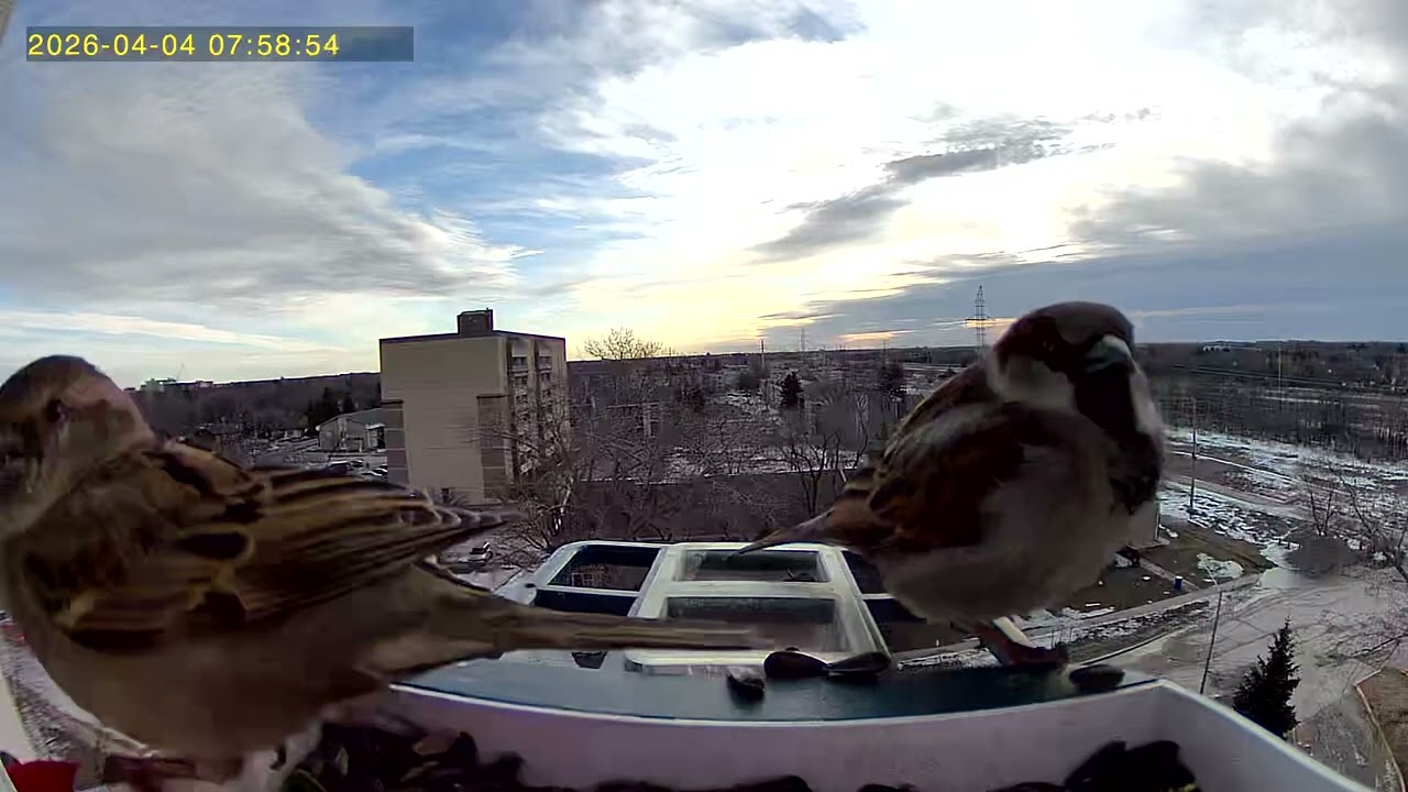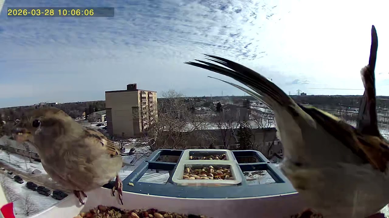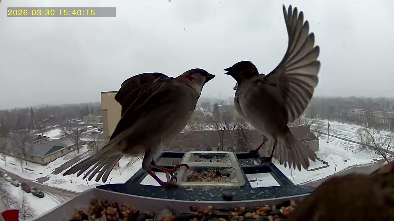 • Feathered friends are frisky on a snowy Spring day. #Birdcam