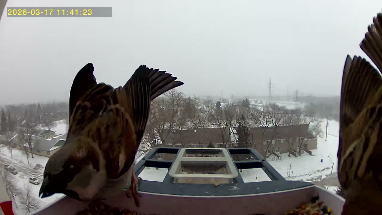 Feathered friends are frisky on a snowy Spring day. #Birdcam